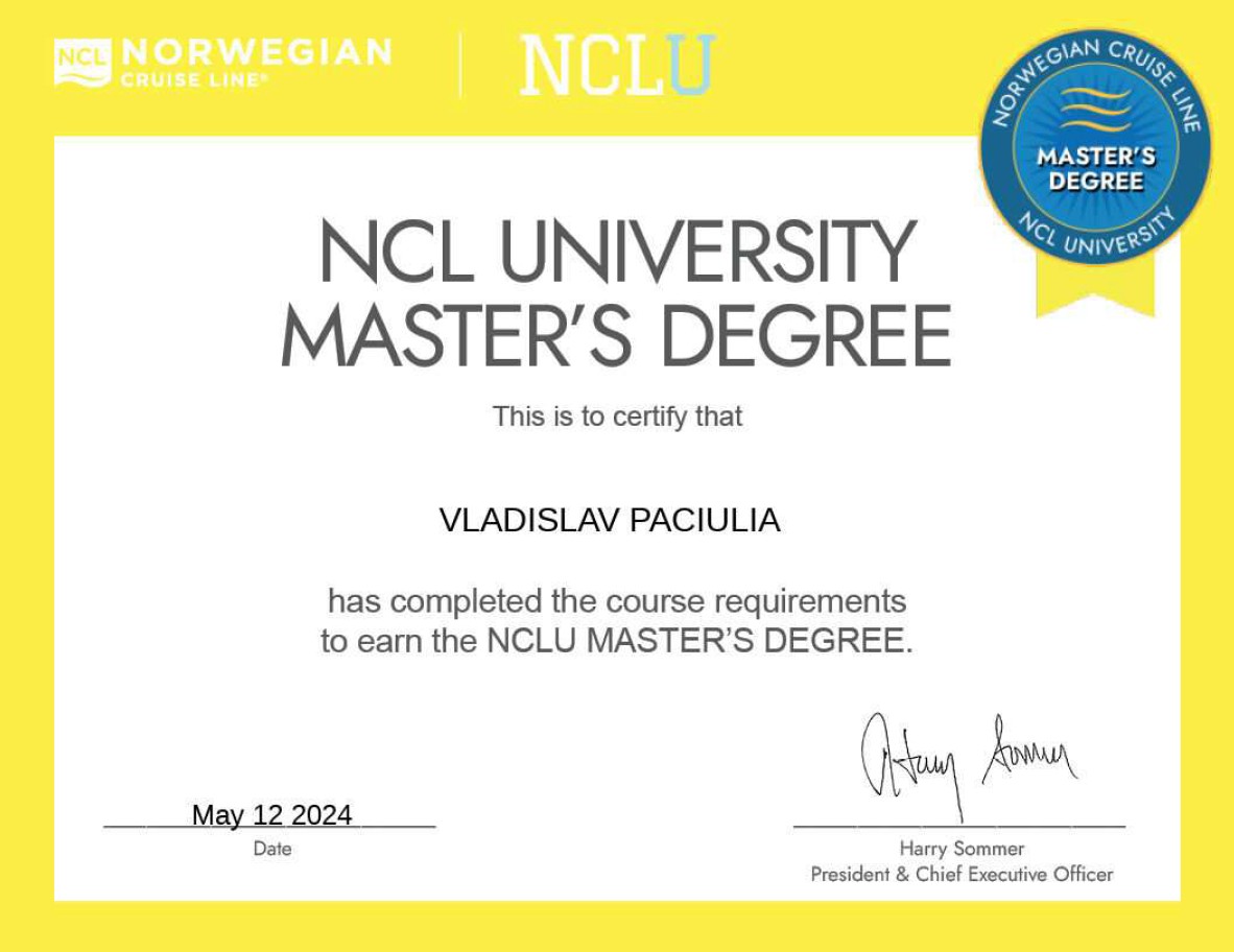 When you book your voyage with Veni Sara Flo LLC, you are guided by specialized knowledge. We are proud to have earned the official NCL University Master Degree certification.