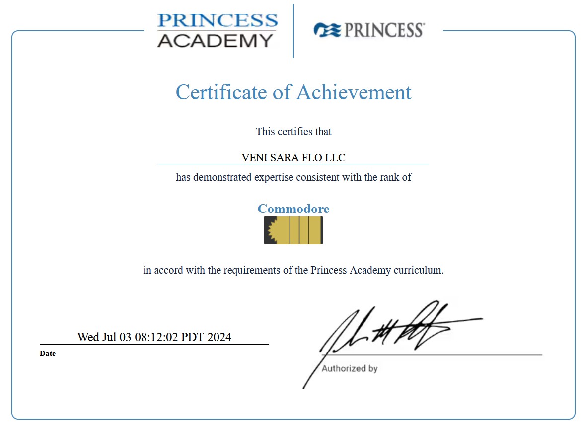 When you book your voyage with Veni Sara Flo LLC, you are guided by specialized knowledge. We are proud to have earned the official Princess Cruises Commodore Certification.