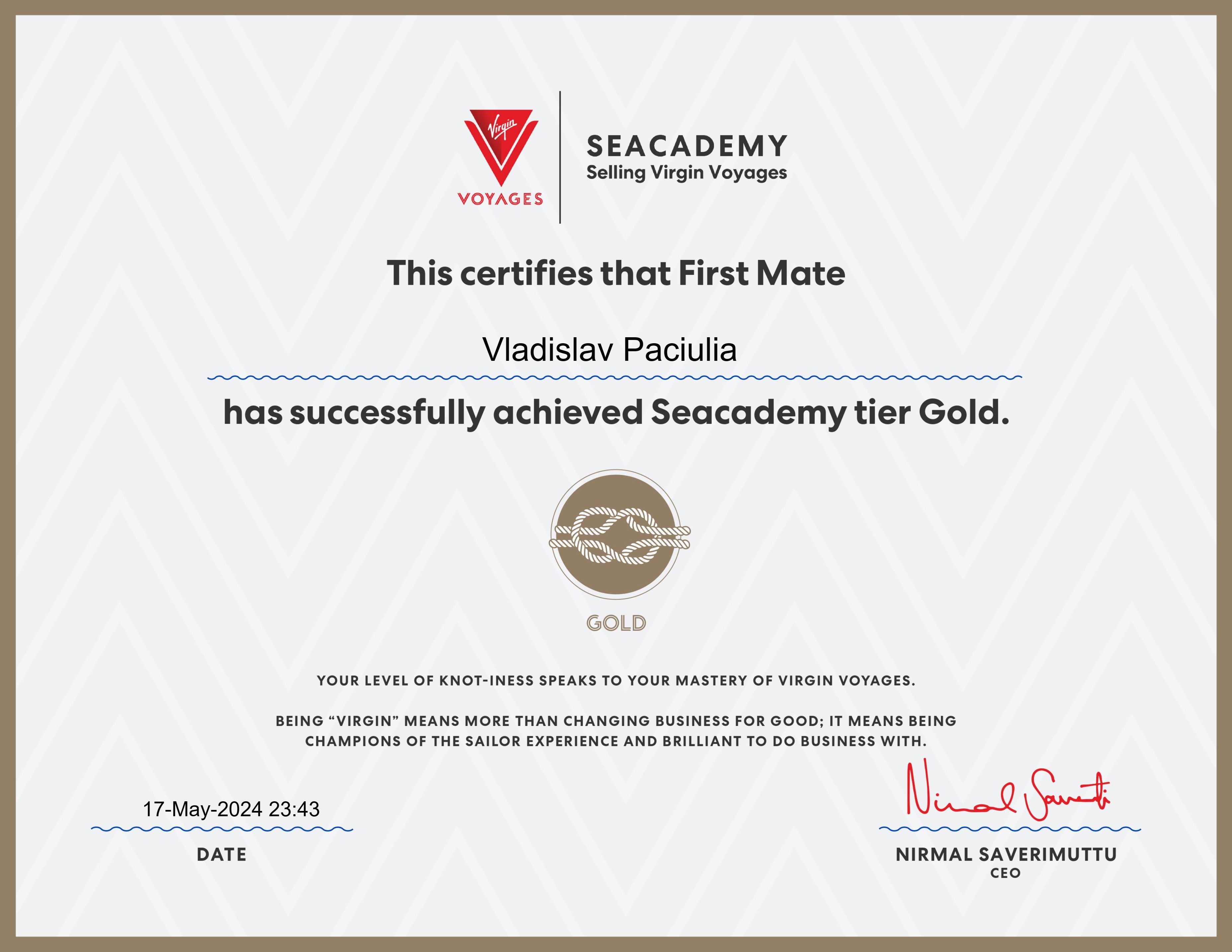 When you book your voyage with Veni Sara Flo LLC, you are guided by specialized knowledge. We are proud to have earned the official First Mate Gold Tier Certification.